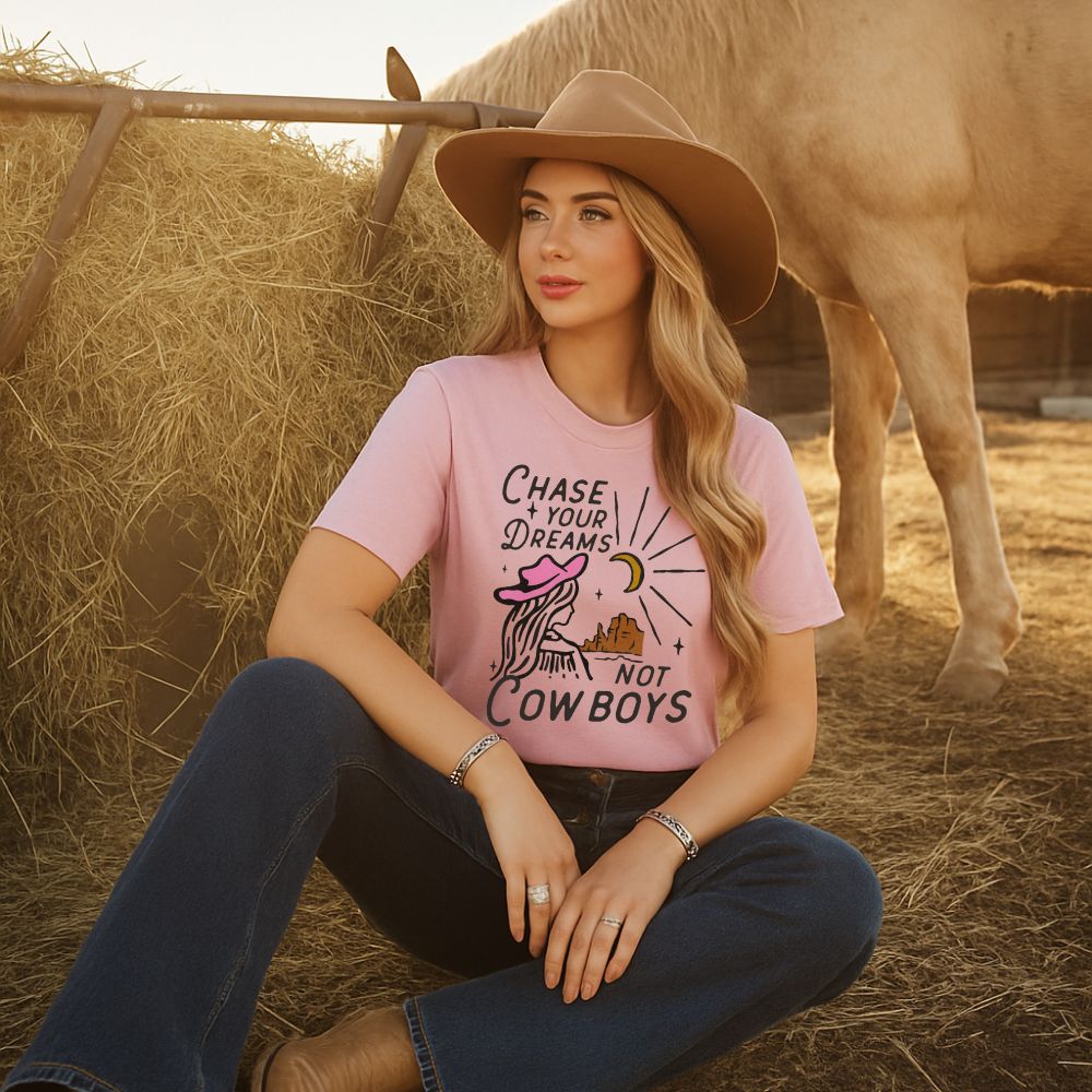 Chase Your Dreams. Not Cowboys. Grab this sweet design on a Pink Unisex Tee.