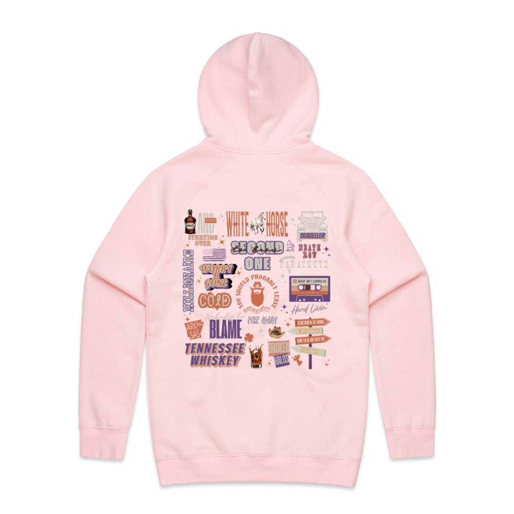 All your favourite songs in one stunning front and back printed Set List design. Choose to get this awesome print on a high quality Hoodie in Pink or Black.